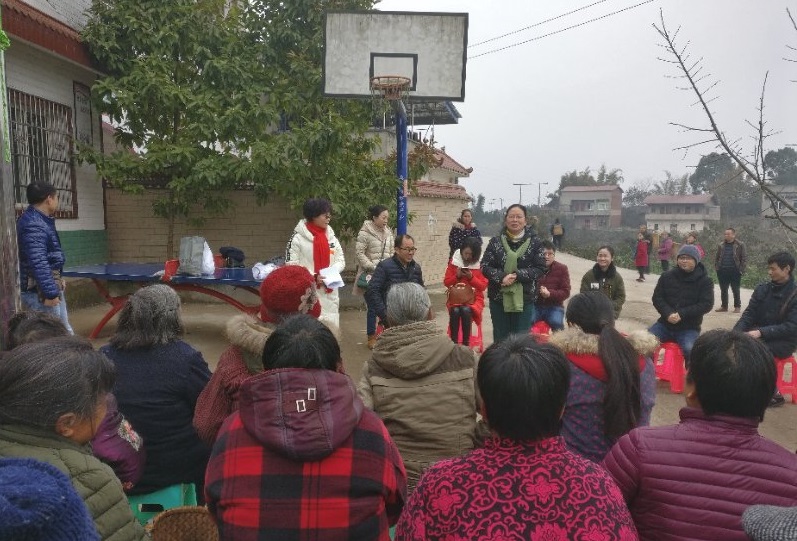 1月30日上午,在張麗的帶領下,九三學社社員一行10多人來到資中縣甘露鎮(zhèn)糖坊村。鄧粉蓉首先為到場的村民進行了《關于糖尿病、高血壓等農村常見病的預防和治療》的講座,還就國家現(xiàn)行醫(yī)保政策和謹防保健欺騙等相關熱點問題與村民們進行了互動。隨后醫(yī)衛(wèi)專家們?yōu)楫數(shù)卮迕襁M行了測血壓血糖、健康咨詢、發(fā)放健康資料等活動。