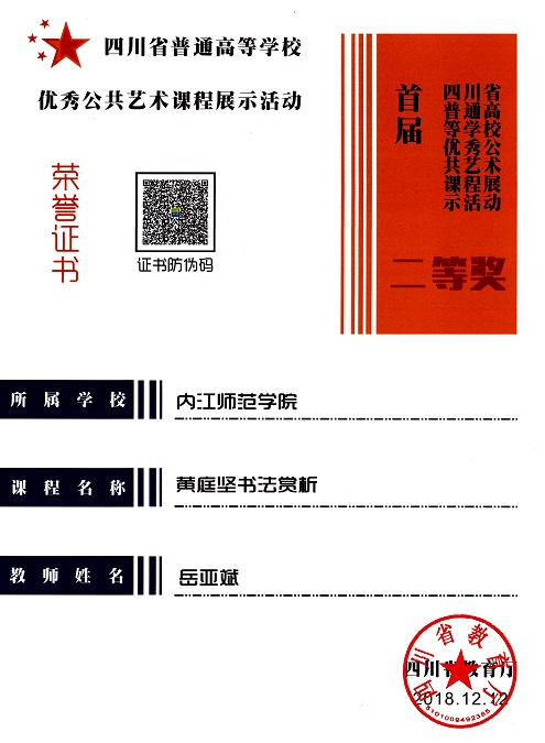 按照《四川省教育廳關(guān)于舉辦首屆四川省普通高等學(xué)校優(yōu)秀公共藝術(shù)課程展示活動(dòng)的通知》精神,學(xué)校積極組織教師參加競(jìng)賽,來(lái)自張大千美術(shù)學(xué)院的九三學(xué)社內(nèi)江師范學(xué)院支社社員岳亞斌在美術(shù)與設(shè)計(jì)類課程中獲省級(jí)二等獎(jiǎng),11月底將在四川師范大學(xué)進(jìn)行現(xiàn)場(chǎng)展示和交流。
